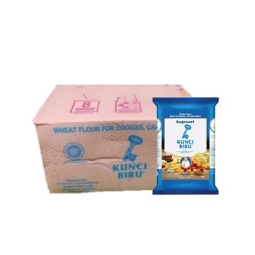 1 Kardus isi 12 pcs tepung terigu Kunci Biru 1 Kg. Tepung terigu protein rendah. Cocok untuk pizza, bakwan, pie susu, nastar, cookies, dan kreasi biskuit atau makanan kering lainnya. Produk sudah terverifikasi halal. Dikirim menggunakan kardus original produk.